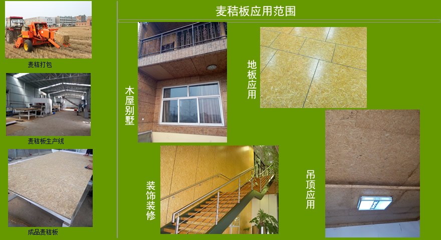 秸桿板材具有強度高、產品幅面大、防火、防水、綠色環保、成本低廉等特點。產品花色品種繁多,有上百種,產品能釘、鋸、刨、粘,具有與木質板完全相同的應用與加工特性。廣泛用于商場、賓館、酒家、夜總會、車站、辦公樓、居室的墻壁、門窗、墻裙、吊頂等室內裝飾,在高檔家具、房門、隔間方面也用途廣泛。